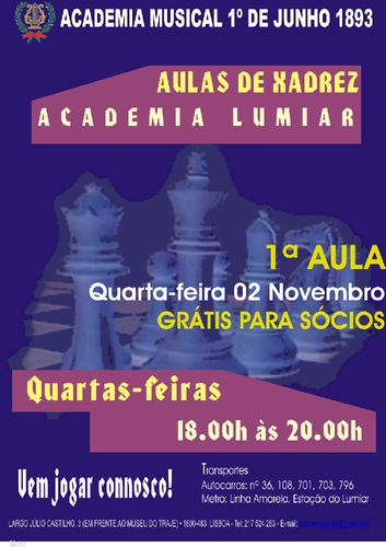 O Xadrez e o Teatro estão finalmente de volta à Academia, para mais um ano lectivo de troca de conhecimentos e de experiências e, claro, muito, muito convívio. O Grupo Coral irá sofrer já em Novembro uma alteração de horário, passando os seus encontros das terças para as segundas-feiras, a partir das 21.00h. Três actividades grátis para Sócios. Escolhe a(s) tua(s) preferida(s) e participa!