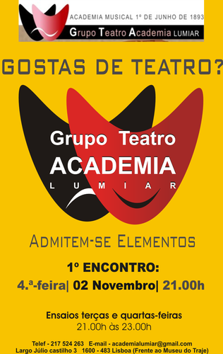 Também o núcleo de Teatro da Academia terá o seu primeiro encontro no dia 2 de Novembro, pelas 21.00h. O Grupo está a recrutar novos elementos, pelo que se gostas de representar e o teatro é a tua paixão, não podes perder esta oportunidade! À semelhança do ano passado, teremos a directora Artística Elsa Branco a comandar os ensaios, agendados para todas as terças e quartas-feiras, das 21.00h às 23.00h.