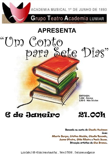 O espectáculo de Natal terminará em grande com o Grupo de Teatro da Academia, em estreia com a peça - Um conto para Sete Dias, baseado no conto de Claudio Hochman, com Alberta Borges, Cristina Alcobia, Cláudia Rezende, Joana Oliveira, Gilda Ribeiro e Paulo Sousa. Direcção artística de Elsa Branco.